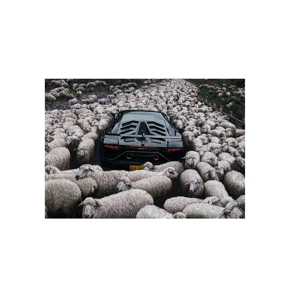 Quadro Decorativo Canvas – Ovelha Negra / Pomba / Carro no Rebanho – Arte Moderna e Minimalista